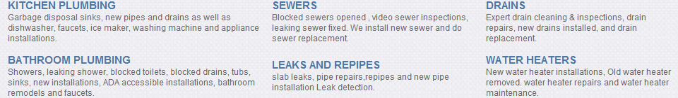 We provide Plumbing services for: Sewers, Leaks & Repipes, Drains, Water Heaters, Backflow, And Even Commercial Work. We take pride in being able to offer the above services, and so we make it a point to have the latest technology in plumbing tools, as well as making sure we only employee highly trained and are accredited plumbers. Give us a call today to see how we can help you through your plumbing problems.